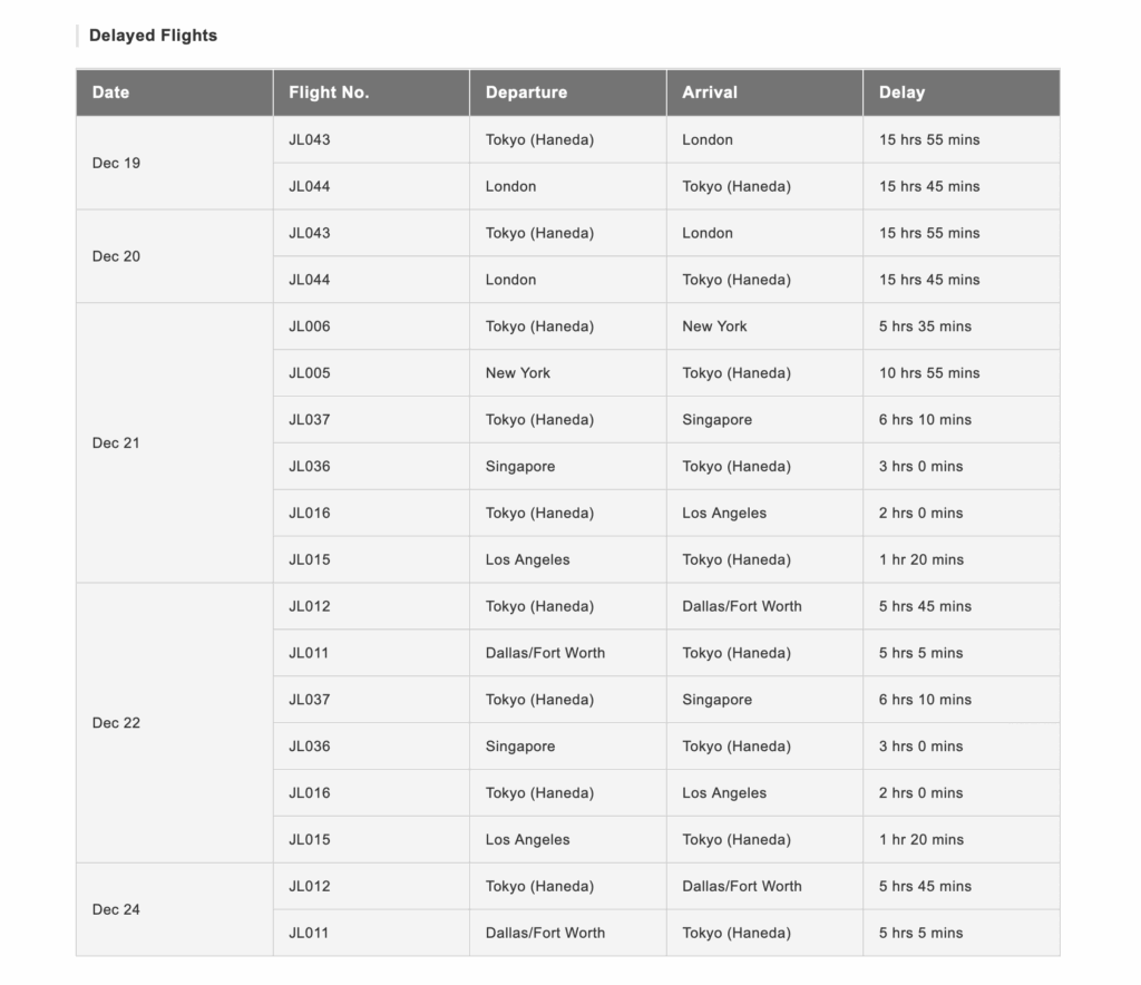 The airline notes that information regarding delays and cancellations for flights on dates after Jan. 1 will be provided later.