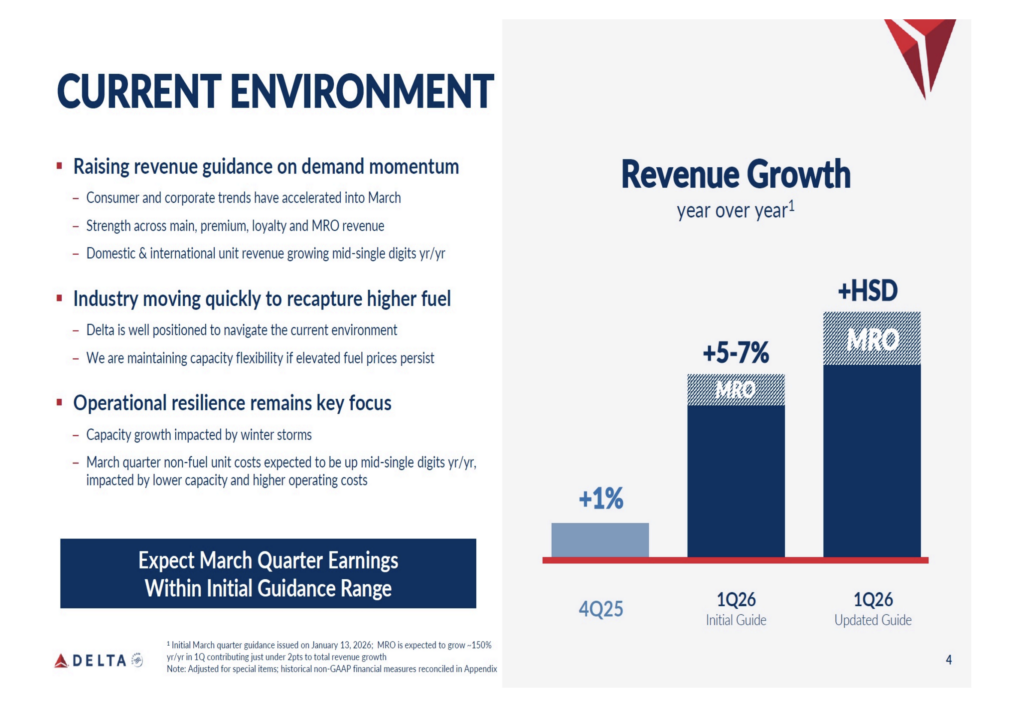 Delta Air Lines forecasts first-quarter revenue growth in the high single digits. Like American, the carrier notes accelerating consumer and corporate trends through March and sees strength across main, premium, loyalty, and MRO revenue.