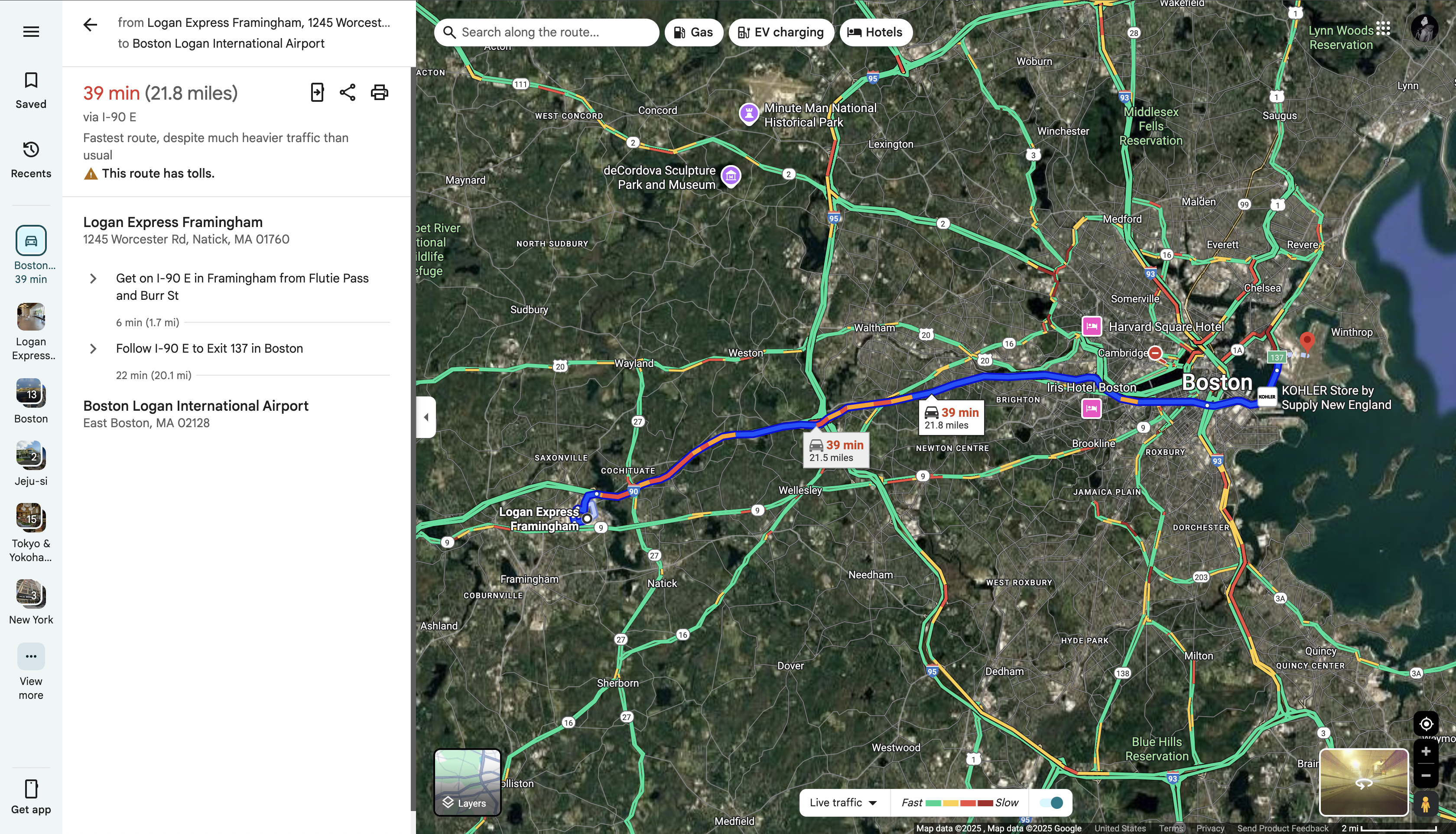 The 22-mile ride from Framingham to Logan Airport is largely dependent on traffic. It could take as quickly as 30 minutes without traffic, or up to an hour with heavy traffic.