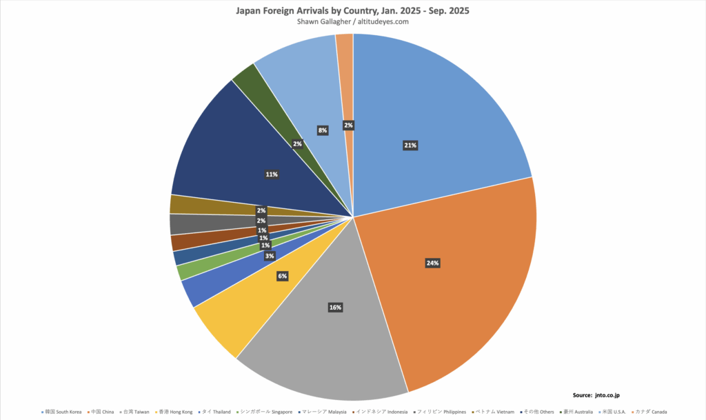 The share of Chinese travelers has increased dramatically over the last 2 years, as China’s post-pandemic travel surge took some time to develop compared to other countries. The figure of 7.5 million Chinese arrivals into Japan so far this year is a 47% increase year over year. However, the growing rift between the two nations now challenges this trend.