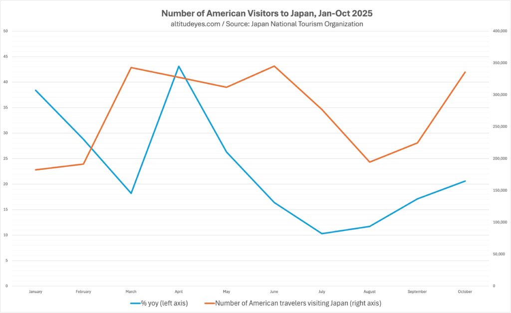 The number of Americans traveling over the Pacific to Japan continues to rise in both numbers and year-over-year increases, proving the resistance of the US to Japan market in 2025. Over 2.7 million have traveled from the U.S. to Japan so far, an increase of 22.1% from last year.