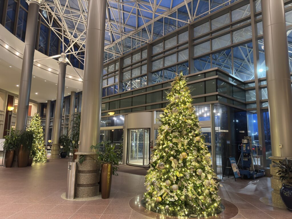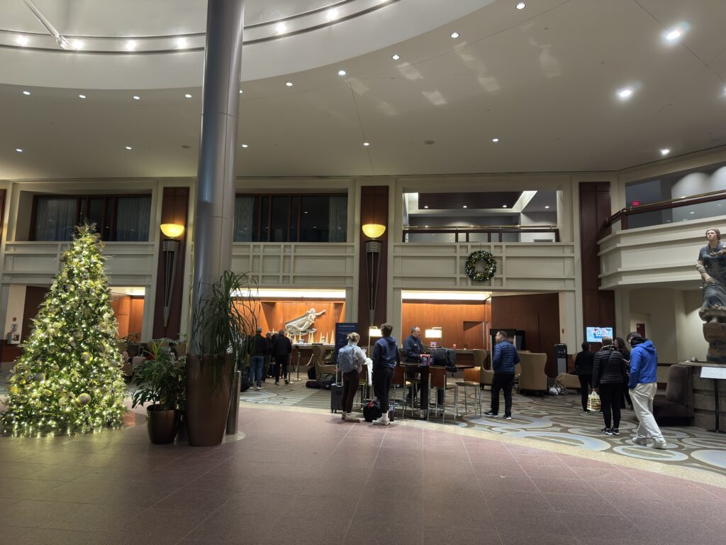 The lobby included a nice high ceiling, and Christmas decorations added a welcome feel.