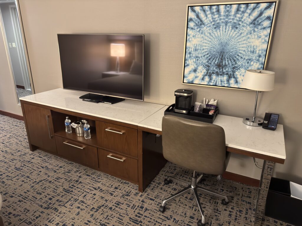 Facing the bed was a 55-inch TV, a desk, and a few other amenities.