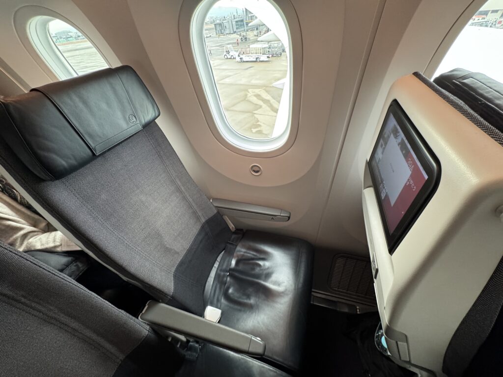 These Japan Airlines Boeing 787-8s sport the Recaro CL3710s in economy class. This is a very common seat on internationally configured aircraft, such as on Cathay Pacific, Delta, and many other airlines. These seats can also be found on JAL’s newer Airbus A350-1000 on international flights, albeit with a slightly different design and dimentions.