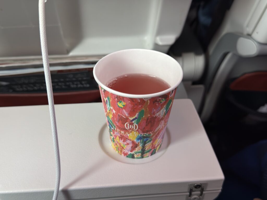 We got a quick beverage service after takeoff. I requested JAL’s Skytime peach and grape juice mix, which is my go-to when I fly with them.