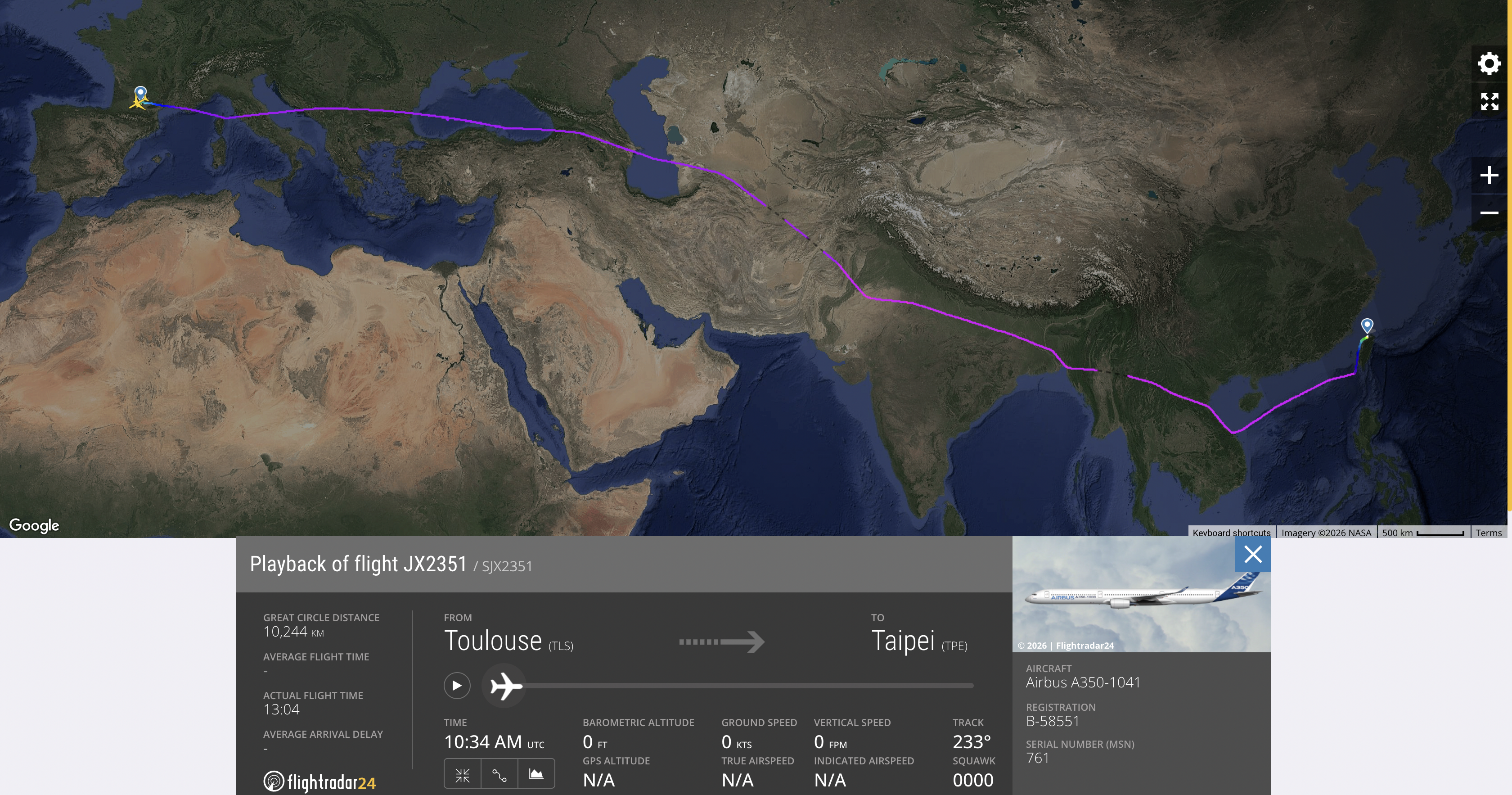 The aircraft is B-58551. The delivery flight was JX2351, departing France at 2:10 p.m. local time and arriving in Taiwan at 10:14 a.m. local time, after 13 hours of flying.