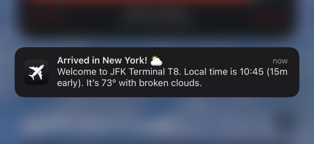 We landed at 10:45 in the morning, while I received a notification from the Flighty App.