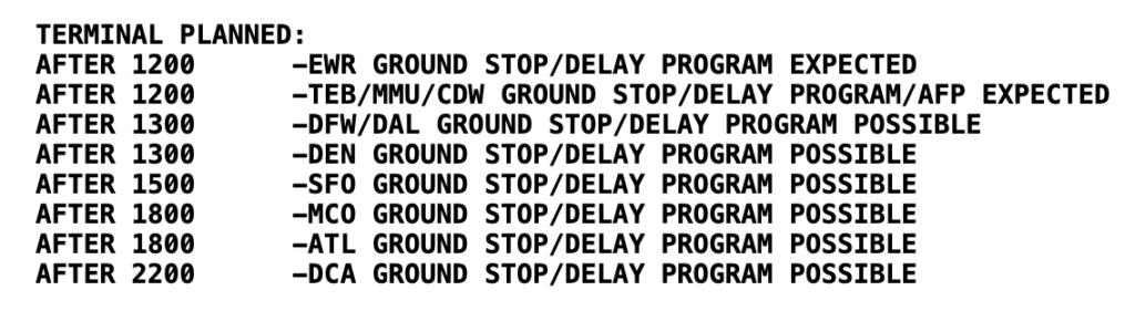 The FAA is expecting to issue ground stops for Newark. Denver, San Francisco, Orlando, Atlanta, and Washington Reagan National can also potentially see ground stop and ground delay programs.