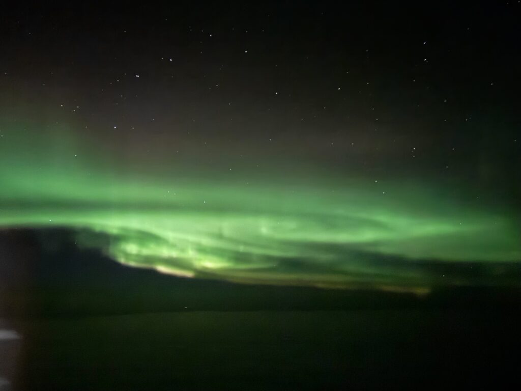 As we flew over Northern Canada, I could see the Northern Lights glowing brightly out of the window.