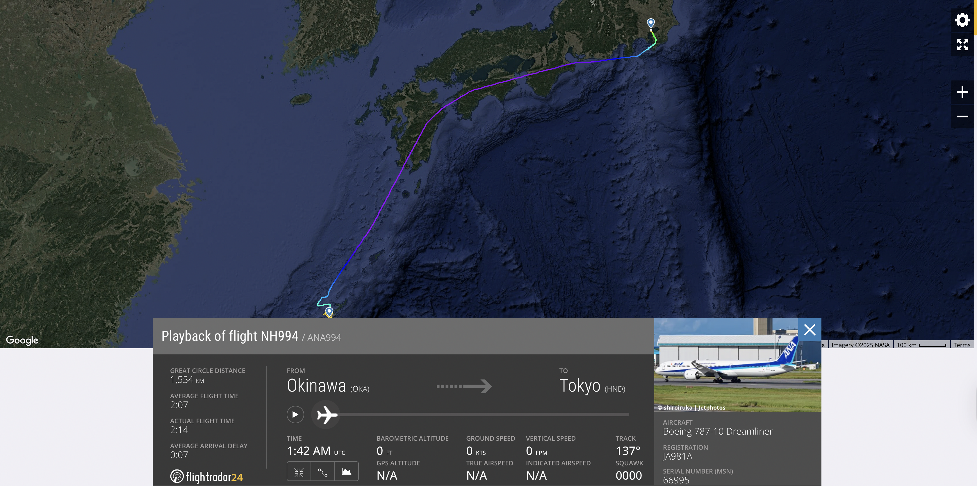 The flight involved was en route from Okinawa to Tokyo Haneda. This flight was already running late for a different reason unrelated to the power banks catching fire. The aircraft involved was JA981A, a 1-year-old Boeing 787-10.