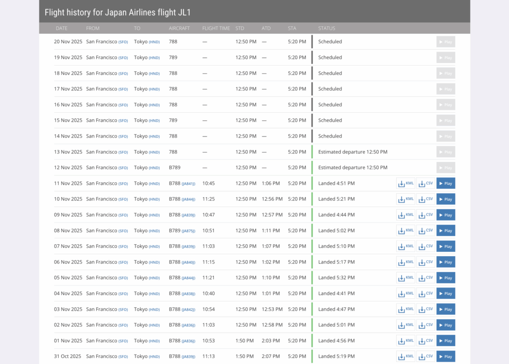 San Fransico is operated by the Boeing 777 during peak seasons, but gets downgraded to a Boeing 787 during off-peak times. This year, flights JL1 and JL2 were flown by a 777-300ER between Mar. 1 and Oct. 25.